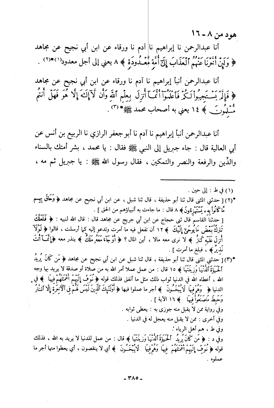 أنا عَبْدُ الرَّحْمَنِ، نا إِبْرَاهِيمُ، نا آدَمُ، نا وَرْقَاءُ، عَنِ ابْنِ أَبِي نَجِيحٍ، عَنْ مُجَاهِدٍ: {§وَلَئِنْ أَخَّرْنَا عَنْهُمُ الْعَذَابَ إِلَى أُمَّةٍ مَعْدُودَةٍ} [هود: 8] ، يَعْنِي: «إِلَى أَجَلٍ مَعْدُودٍ»