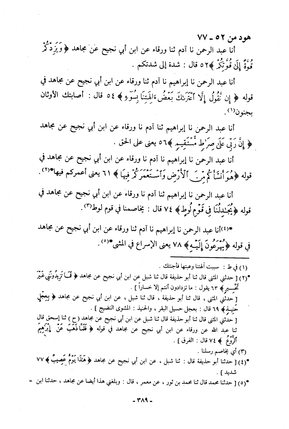 أنا عَبْدُ الرَّحْمَنِ، نا إِبْرَاهِيمُ، نا آدَمُ، ثنا وَرْقَاءُ، عَنِ ابْنِ أَبِي نَجِيحٍ، عَنْ مُجَاهِدٍ: {وَيَزِدْكُمْ قُوَّةً إِلَى قُوَّتِكُمْ} [هود: 52] قَالَ: «§شِدَّةً إِلَى شِدَّتِكُمْ»