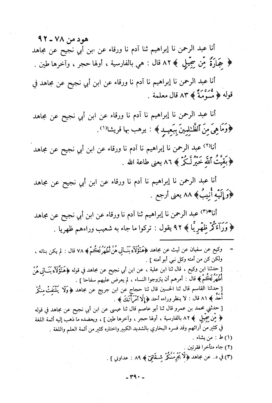 أنا عَبْدُ الرَّحْمَنِ، نا إِبْرَاهِيمُ، ثنا آدَمُ، نا وَرْقَاءُ، عَنِ ابْنِ أَبِي نَجِيحٍ، عَنْ مُجَاهِدٍ: {حِجَارَةً مِنْ سِجِّيلٍ} [هود: 82] قَالَ: «§هِيَ بِالْفَارِسِيَّةِ، أَوَّلُهَا حَجَرٌ، وَآخِرُهَا طِينٌ»