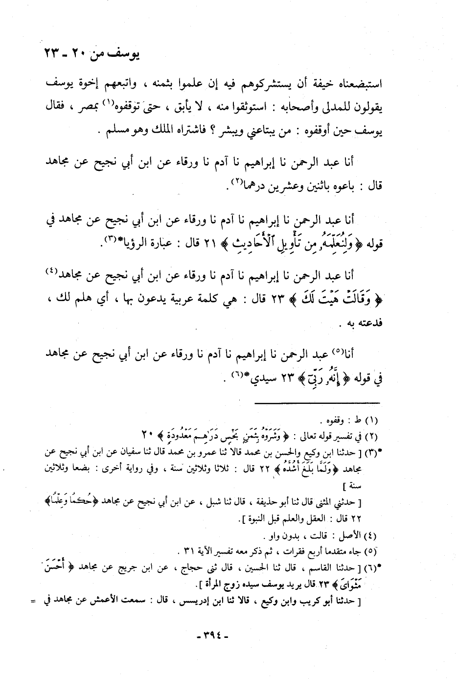 أنا عَبْدُ الرَّحْمَنِ، نا إِبْرَاهِيمُ، نا آدَمُ، نا وَرْقَاءُ، عَنِ ابْنِ أَبِي نَجِيحٍ، عَنْ مُجَاهِدٍ، فِي قَوْلِهِ: {§وَلِنُعَلِّمَهُ مِنْ تَأْوِيلِ الْأَحَادِيثِ} [يوسف: 21] قَالَ: «عِبَارَةُ الرُّؤْيَا»