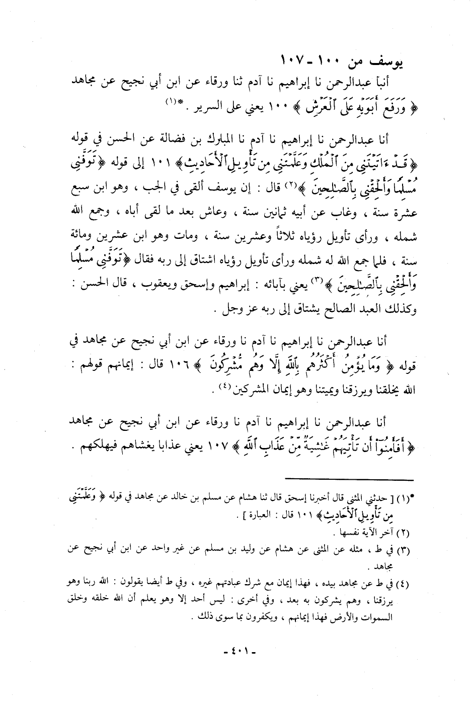 أنا عَبْدُ الرَّحْمَنِ، نا إِبْرَاهِيمُ، نا آدَمُ، نا وَرْقَاءُ، عَنِ ابْنِ أَبِي نَجِيحٍ، عَنْ مُجَاهِدٍ، فِي قَوْلِهِ: {وَمَا يُؤْمِنُ أَكْثَرُهُمْ بِاللَّهِ إِلَّا وَهُمْ مُشْرِكُونَ} [يوسف: 106] قَالَ: " §إِيمَانَهُمْ قَوْلُهُمُ: اللَّهُ يَخْلُقُنَا وَيَرْزُقُنَا، وَيُمِيتُنَا وَهُوَ إِيمَانُ الْمُشْرِكِينَ "