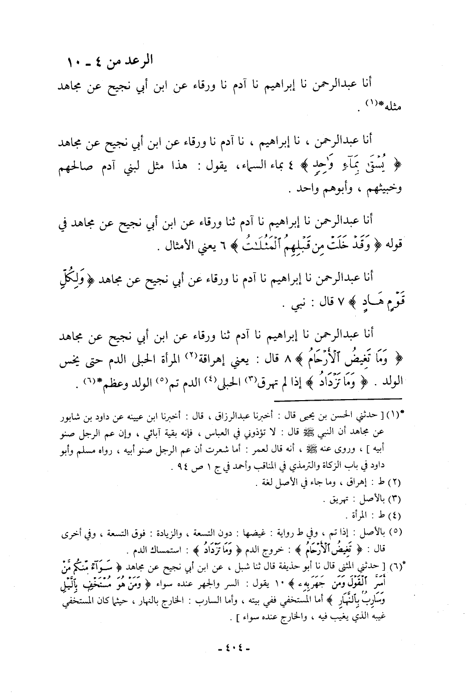 أنا عَبْدُ الرَّحْمَنِ، نا إِبْرَاهِيمُ، نا آدَمُ، ثنا وَرْقَاءُ، عَنِ ابْنِ أَبِي نَجِيحٍ، عَنْ مُجَاهِدٍ: {وَمَا تَغِيضُ الْأَرْحَامُ} [الرعد: 8] قَالَ: " §يَعْنِي إِهْرَاقَةَ الْمَرْأَةِ الْحُبْلَى الدَّمَ حَتَّى يَخِسَّ الْوَلَدُ. {وَمَا تَزْدَادُ} [الرعد: 8] «إِذَا لَمْ تُهْرِقِ الْحُبْلَى الدَّمَ تَمَّ الْوَلَدُ وَعَظُمَ»