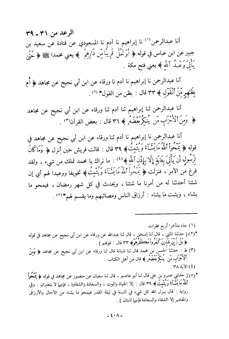 أنا عَبْدُ الرَّحْمَنِ، نا إِبْرَاهِيمُ، نا آدَمُ، ثنا وَرْقَاءُ، عَنِ ابْنِ أَبِي نَجِيحٍ، عَنْ مُجَاهِدٍ، فِي قَوْلِهِ: {يَمْحُو اللَّهُ مَا يَشَاءُ وَيُثْبِتُ} [الرعد: 39] قَالَ: " §قَالَتْ قُرَيْشٌ: حِينَ أُنْزِلَ {وَمَا كَانَ لِرَسُولِ أَنْ يَأْتِيَ بِآيَةٍ إِلَّا بِإِذْنِ اللَّهِ} [الرعد: 38] مَا نَرَاكَ يَا مُحَمَّدُ تَمْلِكُ مِنْ شَيْءٍ، وَلَقَدْ فُرِغَ مِنَ الْأَمْرِ، فَنَزَلَتْ {يَمْحُو اللَّهُ مَا يَشَاءُ وَيُثْبِتُ} [الرعد: 39] تَخْوِيفًا وَوَعِيدًا لَهُمْ أَيْ إِنْ شِئْنَا أَحْدَثْنَا لَهُ مِنْ أَمْرِنَا مَا شِئْنَا، وَيَحْدُثُ فِي كُلِّ شَهْرِ رَمَضَانَ، فَيَمْحُو مَا يَشَاءُ، وَيُثْبِتُ مَا يَشَاءُ: أَرْزَاقَ النَّاسِ وَمَصَائِبَهُمْ وَمَا يَقْسِمُ لَهُمْ "
