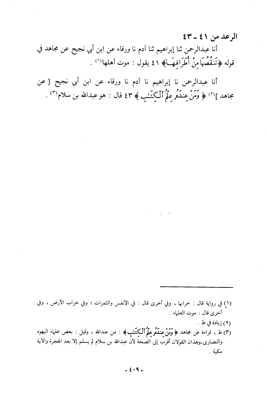 أنا عَبْدُ الرَّحْمَنِ، نا إِبْرَاهِيمُ، نا آدَمُ، نا وَرْقَاءُ، عَنِ ابْنِ أَبِي نَجِيحٍ، عَنْ مُجَاهِدٍ: {§وَمَنْ عِنْدَهُ عِلْمُ الْكِتَابِ} [الرعد: 43] قَالَ: «هُوَ عَبْدُ اللَّهِ بْنُ سَلَامٍ»