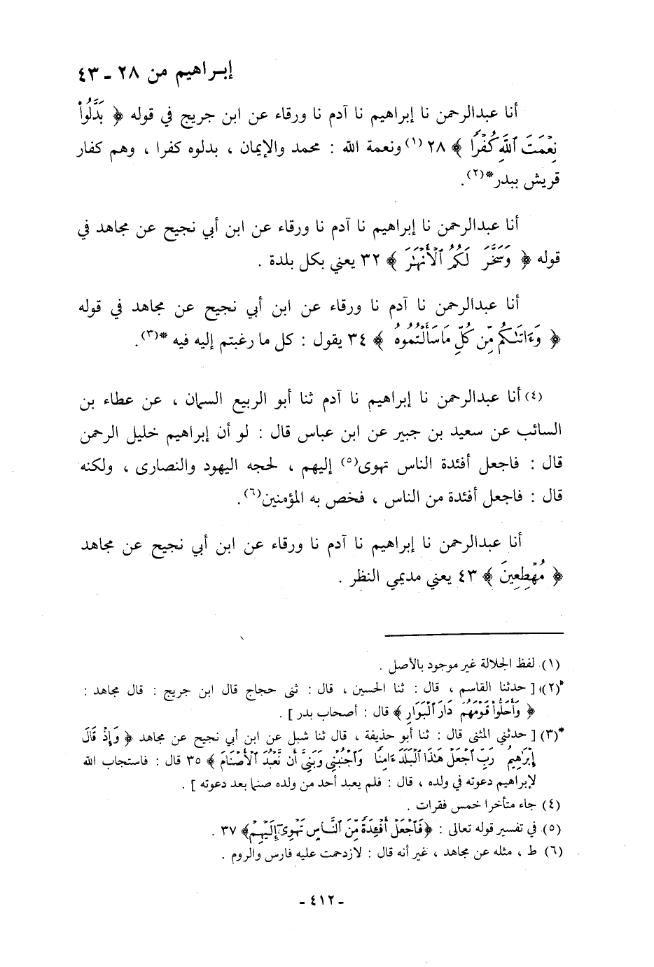 أنا عَبْدُ الرَّحْمَنِ، نا إِبْرَاهِيمُ، نا آدَمُ، نا وَرْقَاءُ، عَنِ ابْنِ أَبِي نَجِيْحٍ: فِي قَوْلِهِ: {§بَدَّلُوا نِعْمَةَ اللَّهِ كُفْرًا} [إبراهيم: 28] " وَنِعْمَةُ اللَّهِ: مُحَمَّدٌ وَالْإِيمَانُ، بَدَّلُوهُ كُفْرًا، وَهُمْ كُفَّارُ قُرَيْشٍ بِبَدْرٍ "