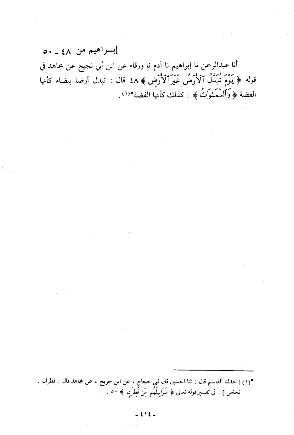 أنا عَبْدُ الرَّحْمَنِ، نا إِبْرَاهِيمُ، نا آدَمُ، نا وَرْقَاءُ، عَنِ ابْنِ أَبِي نَجِيحٍ، عَنْ مُجَاهِدٍ، فِي قَوْلِهِ: {يَوْمَ تُبَدَّلُ الْأَرْضُ غَيْرَ الْأَرْضِ} [إبراهيم: 48] قَالَ: «§تُبَدَّلُ أَرْضًا بَيْضَاءَ كَأَنَّهَا الْفِضَّةُ، وَالسَّمَوَاتُ كَذَلِكَ كَأَنَّهَا الْفِضَّةُ»