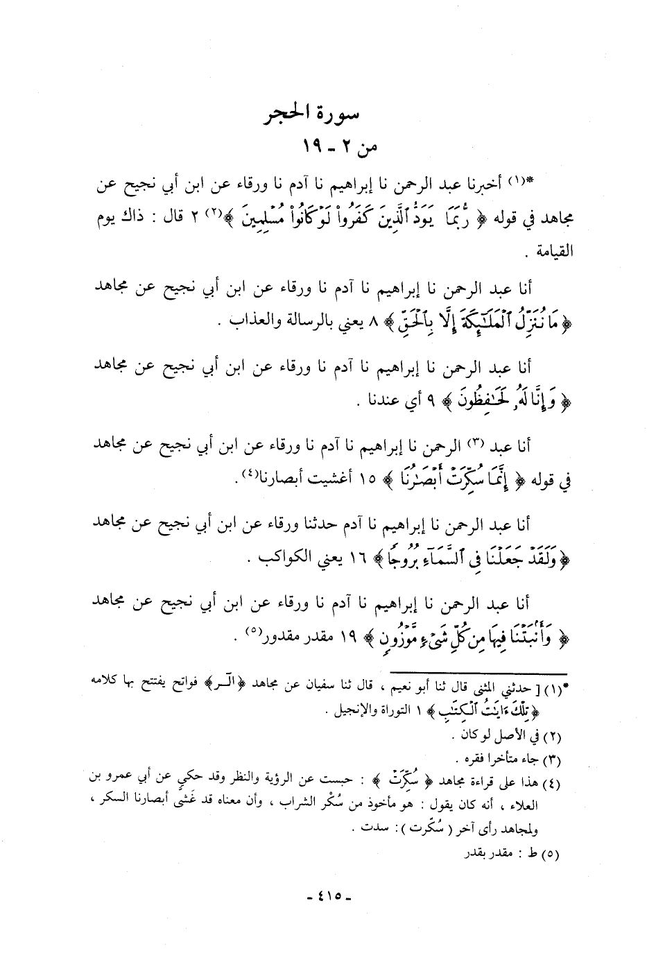 أنا عَبْدُ الرَّحْمَنِ، نا إِبْرَاهِيمُ، نا آدَمُ، نا وَرْقَاءُ، عَنِ ابْنِ أَبِي نَجِيحٍ، عَنْ مُجَاهِدٍ، فِي قَوْلِهِ: {إِنَّمَا سُكِّرَتْ أَبْصَارُنَا} [الحجر: 15] «§أُغْشِيَتْ أَبْصَارُنَا»