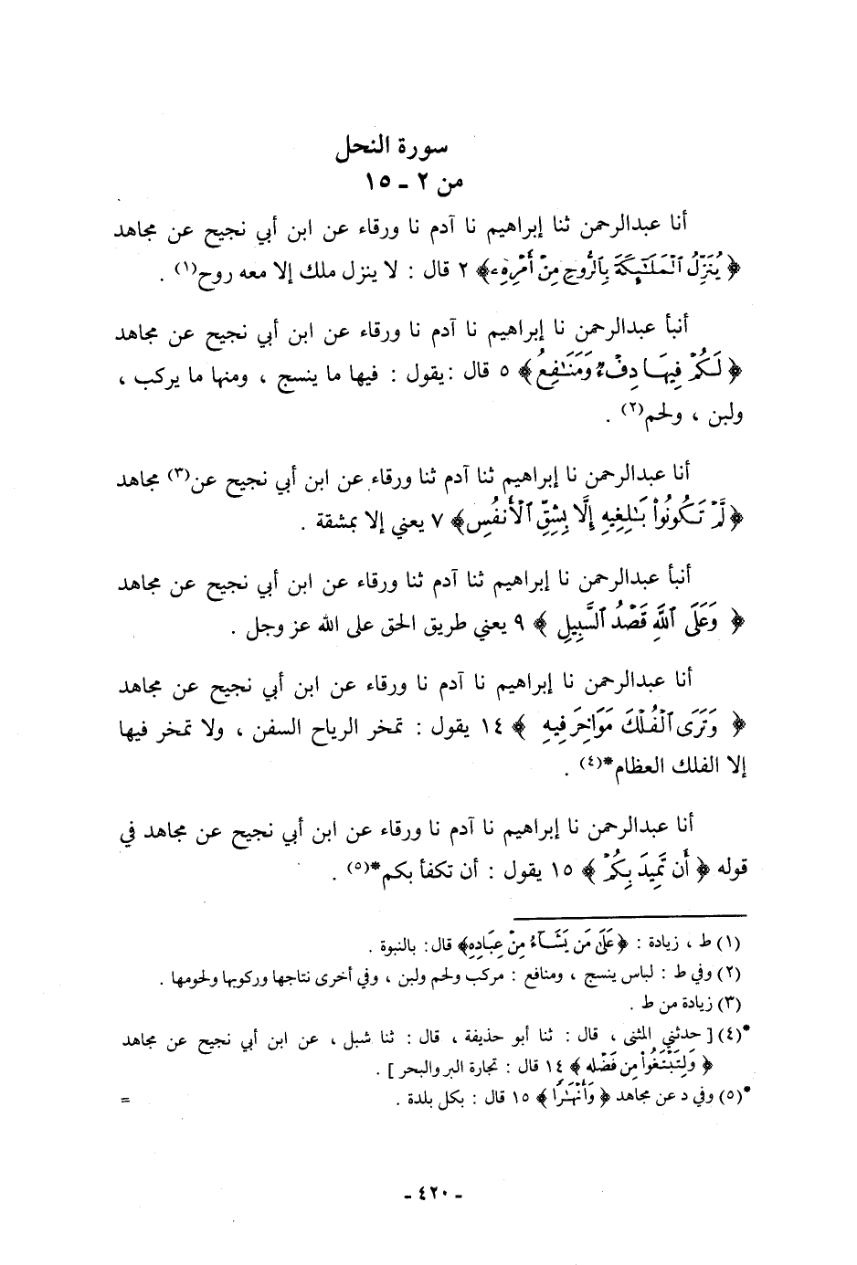 أنا عَبْدُ الرَّحْمَنِ، نا إِبْرَاهِيمُ، ثنا آدَمُ، ثنا وَرْقَاءُ، عَنِ ابْنِ أَبِي نَجِيحٍ، عَنْ مُجَاهِدٍ: {§لَمْ تَكُونُوا بَالِغِيهِ إِلَّا بِشِقِّ الْأَنْفُسِ} [النحل: 7] ، يَعْنِي: «إِلَّا بِمَشَقَّةٍ»