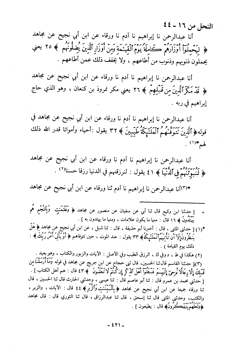 أنا عَبْدُ الرَّحْمَنِ، نا إِبْرَاهِيمُ، نا آدَمُ، نا وَرْقَاءُ، عَنِ ابْنِ أَبِي نَجِيحٍ، عَنْ مُجَاهِدٍ، {لِيَحْمِلُوا أَوْزَارَهُمْ} [النحل: 25] كَامِلَةً يَوْمَ الْقِيَامَةِ وَمِنْ أَوْزَارِ الَّذِينَ يُضِلُّونَهُمْ، يَعْنِي: «§يَحْمِلُونَ ذُنُوبَهُمْ وَذُنُوبَ مَنْ أَطَاعَهُمْ، وَلَا يُخَفِّفُ ذَلِكَ عَمَّنْ أَطَاعَهُمْ»