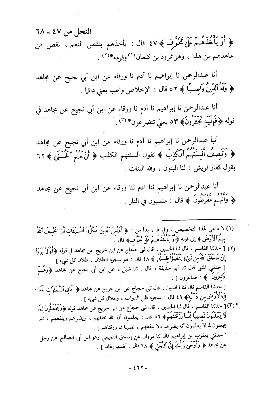 أنبأ عَبْدُ الرَّحْمَنِ، نا إِبْرَاهِيمُ، نا آدَمُ، نا وَرْقَاءُ، عَنِ ابْنِ أَبِي نَجِيحٍ، عَنْ مُجَاهِدٍ: {§وَتَصِفُ أَلْسِنَتُهُمُ الْكَذِبَ} [النحل: 62] «تَقُولُ أَلْسِنَتُهُمُ الْكَذِبَ» ، {أَنَّ لَهُمُ الْحُسْنَى} [النحل: 62] " يَقُولُ كُفَّارُ قُرَيْشٍ: لَنَا الْبَنُونَ، وَلِلَّهِ الْبَنَاتُ "