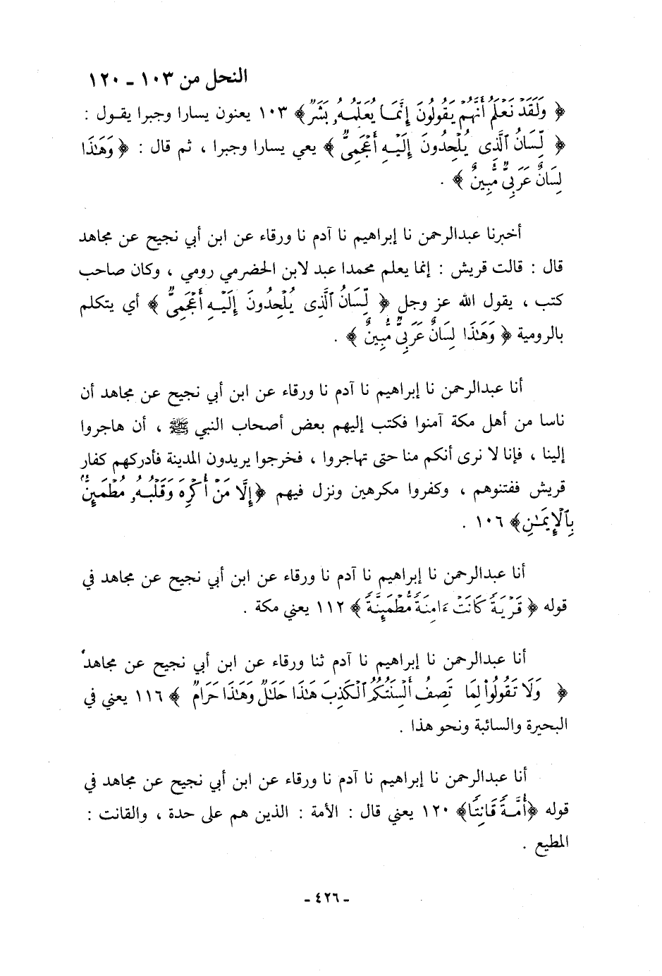 أَخْبَرَنَا عَبْدُ الرَّحْمَنِ، نا إِبْرَاهِيمُ، نا آدَمُ، نا وَرْقَاءُ، عَنِ ابْنِ أَبِي نَجِيحٍ، عَنْ مُجَاهِدٍ، قَالَ: " §قَالَتْ قُرَيْشٌ: إِنَّمَا يُعَلِّمُ مُحَمَّدًا عَبْدٌ لِابْنِ الْحَضْرَمِيِّ رُومِيٌّ، وَكَانَ صَاحِبَ كُتُبٍ يَقُولُ اللَّهُ عَزَّ وَجَلَّ: {لِسَانُ الَّذِي يُلْحِدُونَ إِلَيْهِ أَعْجَمِيُّ} [النحل: 103] أَيْ: «يَتَكَلَّمُ بِالرُّومِيَّةِ» ، {وَهَذَا لِسَانٌ عَرَبِيُّ مُبِينٌ} [النحل: 103]