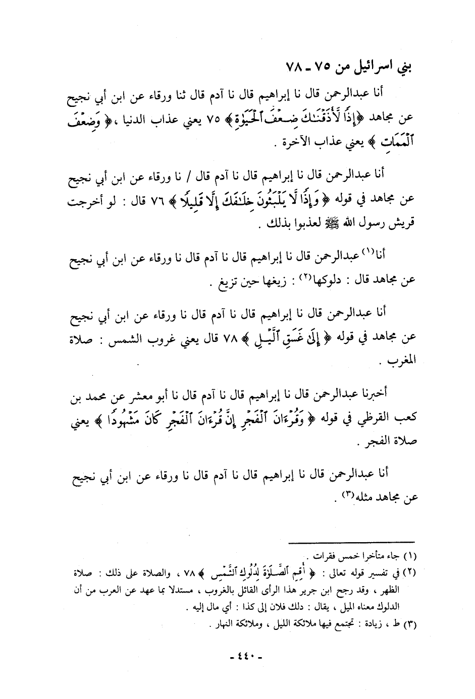 أَخْبَرَنَا عَبْدُ الرَّحْمَنِ، قَالَ: نا إِبْرَاهِيمُ، قَالَ: نا آدَمُ، قَالَ: نا أَبُو مَعْشَرٍ، عَنْ مُحَمَّدِ بْنِ كَعْبٍ الْقُرَظِيِّ، فِي قَوْلِهِ: {§وَقُرْآنَ الْفَجْرِ إِنَّ قُرْآنَ الْفَجْرِ كَانَ مَشْهُودًا} [الإسراء: 78] يَعْنِي: «صَلَاةَ الْفَجْرِ» . أنا عَبْدُ الرَّحْمَنِ، قَالَ: نا إِبْرَاهِيمُ، قَالَ: نا آدَمُ، قَالَ: نا وَرْقَاءُ، عَنِ ابْنِ أَبِي نَجِيحٍ، عَنْ مُجَاهِدٍ، مِثْلَهُ