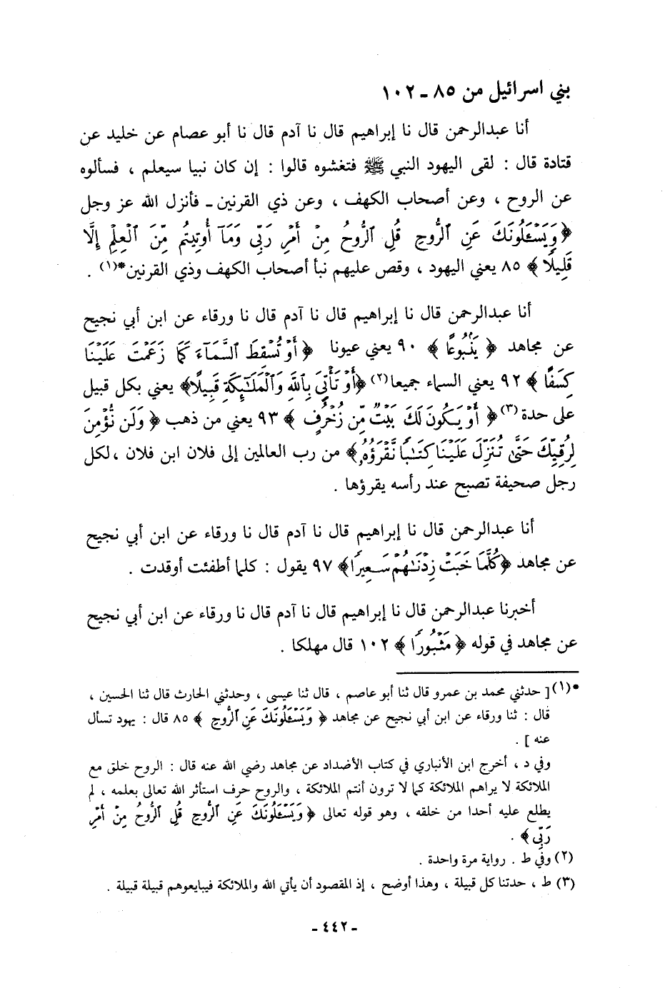أنا عَبْدُ الرَّحْمَنِ، قَالَ: نا إِبْرَاهِيمُ، قَالَ: نا آدَمُ، قَالَ: نا وَرْقَاءُ، عَنِ ابْنِ أَبِي نَجِيحٍ، عَنْ مُجَاهِدٍ، {يَنْبُوعًا} [الإسراء: 90] ، يَعْنِي: «عُيُونَا» . {§أَوْ تُسْقِطَ السَّمَاءَ كَمَا زَعَمْتَ عَلَيْنَا كِسَفًا} [الإسراء: 92] ، يَعْنِي: «السَّمَاءَ جَمِيعًا» ، {أَوْ تَأْتِيَ بِاللَّهِ وَالْمَلَائِكَةِ قَبِيلًا} [الإسراء: 92] ، يَعْنِي: «بِكُلِّ قَبِيلٍ عَلَى حِدَةٍ» ، {أَوْ يَكُونَ لَكَ بَيْتٌ مِنْ زُخْرُفٍ} [الإسراء: 93] ، يَعْنِي: «مِنْ ذَهَبٍ» ، {وَلَنْ نُؤْمِنَ لِرُقِيِّكَ حَتَّى تُنَزِّلَ عَلَيْنَا كِتَابًا نَقْرَؤُهُ} [الإسراء: 93] ، «مِنْ رَبِّ الْعَالَمِينَ إِلَى فُلَانِ بْنِ فُلَانٍ، لِكُلِّ رَجُلٍ صَحِيفَةٌ تُصْبِحُ عِنْدَ رَأْسِهِ يَقْرَؤُهَا»