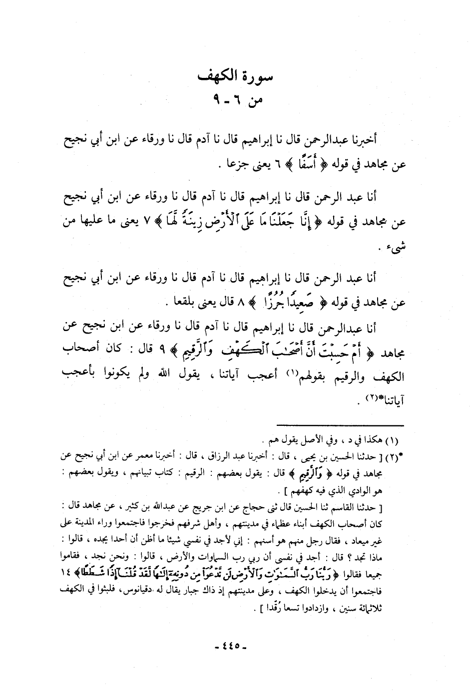 أنا عَبْدُ الرَّحْمَنِ، قَالَ: نا إِبْرَاهِيمُ، قَالَ: نا آدَمُ، قَالَ: نا وَرْقَاءُ، عَنِ ابْنِ أَبِي نَجِيحٍ، عَنْ مُجَاهِدٍ، {أَمْ حَسِبْتَ أَنَّ أَصْحَابَ الْكَهْفِ وَالرَّقِيمِ} [الكهف: 9] قَالَ: " كَانَ §أَصْحَابُ الْكَهْفِ، وَالرَّقِيمِ بَقَوْلِهِمْ أَعْجَبُ آيَاتِنَا، يَقُولُ اللَّهُ: وَلَمْ يَكُونُوا بِأَعْجَبَ آيَاتِنَا "