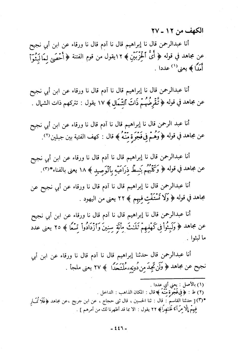 أنا عَبْدُ الرَّحْمَنِ، قَالَ: نا إِبْرَاهِيمُ، قَالَ: نا آدَمُ، قَالَ: نا وَرْقَاءُ، عَنِ ابْنِ أَبِي نَجِيحٍ، عَنْ مُجَاهِدٍ، {§وَلَبِثُوا فِي كَهْفِهِمْ ثَلَاثَ مِائَةٍ سِنِينَ وَازْدَادُوا تِسْعًا} [الكهف: 25] ، يَعْنِي: «عَدَدَ مَا لَبِثُوا»