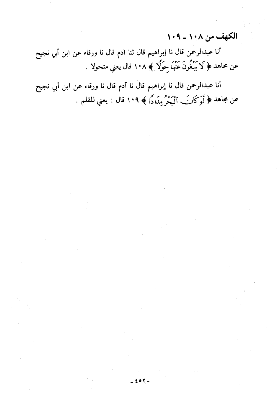 أنا عَبْدُ الرَّحْمَنِ، قَالَ: نا إِبْرَاهِيمُ، قَالَ: نا آدَمُ، قَالَ: نا وَرْقَاءُ، عَنِ ابْنِ أَبِي نَجِيحٍ، عَنْ مُجَاهِدٍ: {§لَوْ كَانَ الْبَحْرُ مِدَادًا} [الكهف: 109] ، قَالَ: «يَعْنِي لِلْقَلَمِ»