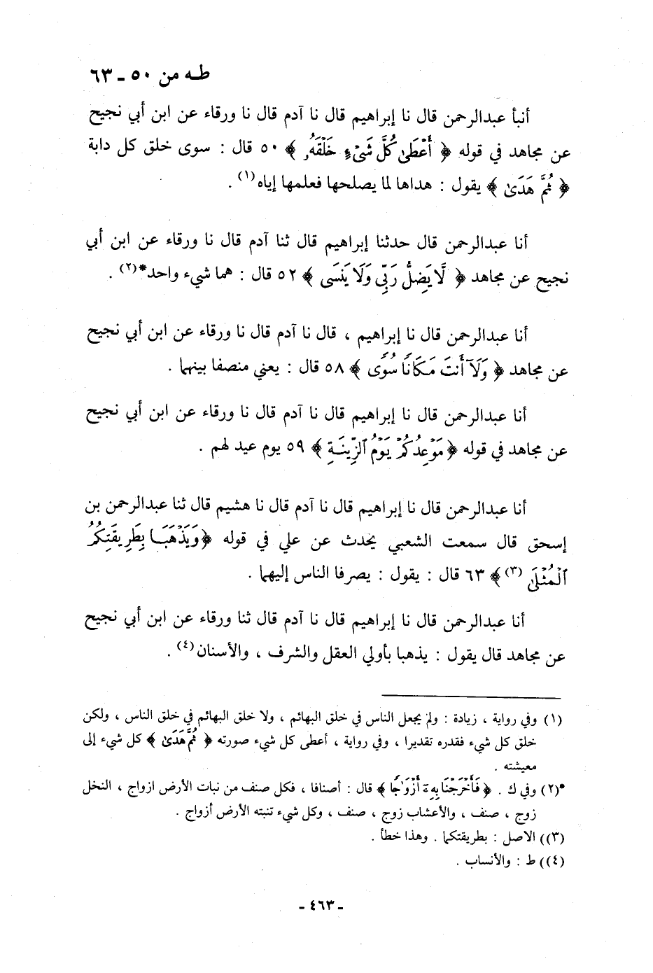 أنبأ عَبْدُ الرَّحْمَنِ، قَالَ: نا إِبْرَاهِيمُ، قَالَ: نا آدَمُ، قَالَ: نا وَرْقَاءُ، عَنِ ابْنِ أَبِي نَجِيحٍ، عَنْ مُجَاهِدٍ، فِي قَوْلِهِ: {§أَعْطَى كُلَّ شَيْءٍ خَلْقَهُ} [طه: 50] قَالَ: «سِوَى خَلْقِ كُلِّ دَابَّةٍ» ، {ثُمَّ هَدَى} [طه: 50] يَقُولُ: «هَدَاهَا لِمَا يُصْلِحُهَا فَعَلَّمَهَا إِيَّاهُ»