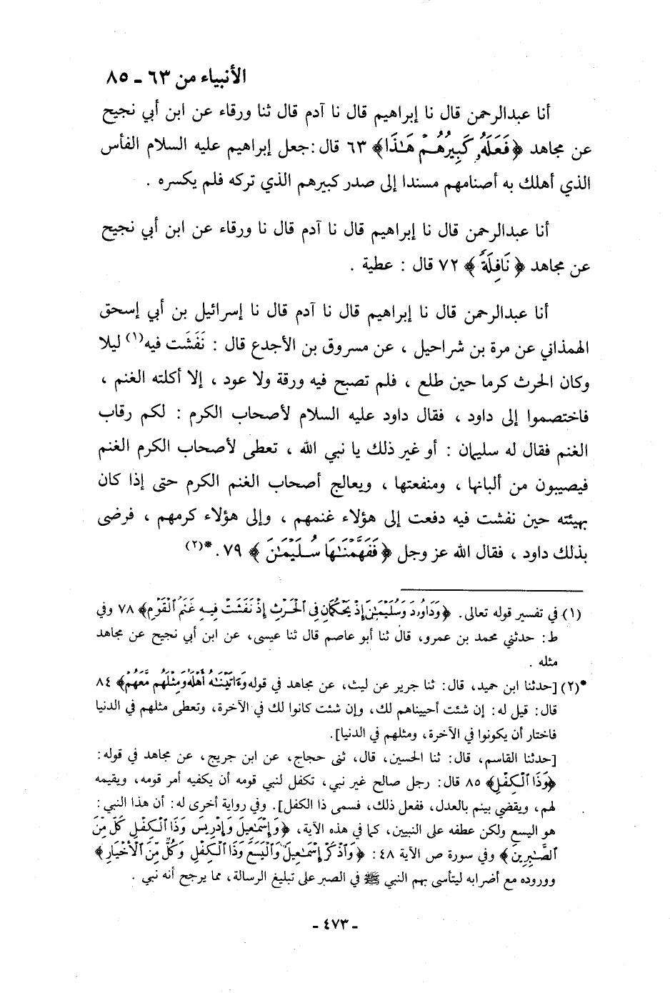 أنا عَبْدُ الرَّحْمَنِ، قَالَ: نا إِبْرَاهِيمُ، قَالَ: نا آدَمُ، قَالَ: نا إِسْرَائِيلُ، عَنْ أَبِي إِسْحَاقَ الْهَمَذَانِيِّ، عَنْ مُرَّةَ بْنِ شَرَاحِيلَ، عَنْ مَسْرُوقِ بْنِ الْأَجْدَعِ، قَالَ: " §نَفَشَتْ فِيهِ لَيْلًا، وَكَانَ الْحَرْثُ كَرْمًا حِينَ طَلَعَ، فَلَمْ يُصْبِحْ فِيهِ وَرَقَةٌ وَلَا عُودٌ، إِلَّا أَكَلَتْهُ الْغَنَمُ، فَاخْتَصَمُوا إِلَى دَاوُدَ، فَقَالَ دَاوُدُ عَلَيْهِ السَّلَامُ لِأَصْحَابِ الْكَرْمِ: لَكُمْ رِقَابُ الْغَنَمِ، فَقَالَ لَهُ سُلَيْمَانُ: أَوْ غَيْرَ ذَلِكَ يَا نَبِيَّ اللَّهِ، تُعْطِي لِأَصْحَابِ الْكَرْمِ الْغَنَمَ فَيُصِيبُونَ مِنْ أَلْبَانِهَا، وَمَنْفَعَتِهَا، وَيُعَالِجُ أَصْحَابُ الْغَنَمِ الْكَرْمَ، حَتَّى إِذَا كَانَ بِهَيْئَتِهِ حِينَ نَفَشَتْ فِيهِ دَفَعْتَ إِلَى هَؤُلَاءِ غَنَمَهُمْ، وَإِلَى هَؤُلَاءِ كَرْمَهُمْ، فَرَضِيَ بِذَلِكَ دَاوُدُ، فَقَالَ اللَّهُ عَزَّ وَجَلَّ: {فَفَهَّمْنَاهَا سُلَيْمَانَ} [الأنبياء: 79]