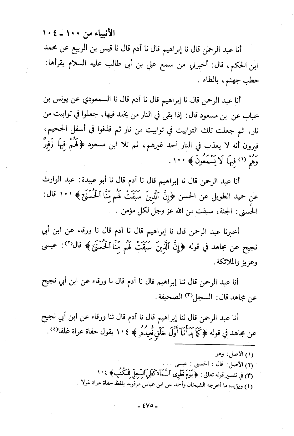 أَخْبَرَنَا عَبْدُ الرَّحْمَنِ، قَالَ: نا إِبْرَاهِيمُ، قَالَ: نا آدَمُ، قَالَ: نا وَرْقَاءُ، عَنِ ابْنِ أَبِي نَجِيحٍ، عَنْ مُجَاهِدٍ، فِي قَوْلِهِ: {§إِنَّ الَّذِينَ سَبَقَتْ لَهُمْ مِنَّا الْحُسْنَى} [الأنبياء: 101] ، قَالَ: «عِيسَى، وَعُزَيْرٌ، وَالْمَلَائِكَةُ»