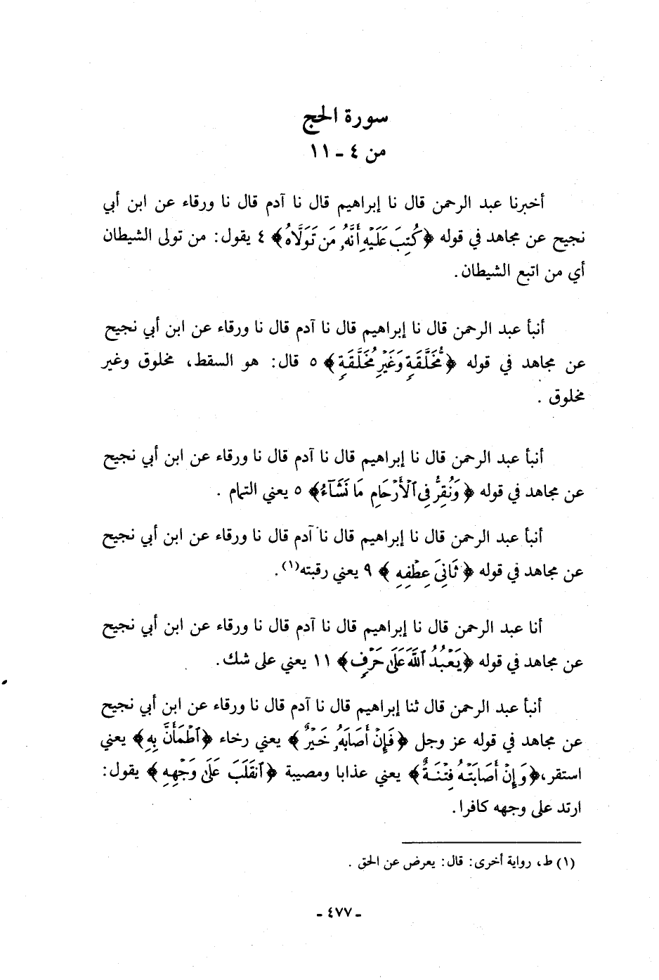أنا عَبْدُ الرَّحْمَنِ، قَالَ: نا إِبْرَاهِيمُ، قَالَ: نا آدَمُ، قَالَ: نا وَرْقَاءُ، عَنِ ابْنِ أَبِي نَجِيحٍ، عَنْ مُجَاهِدٍ، فِي قَوْلِهِ: {§يَعْبُدُ اللَّهَ عَلَى حَرْفٍ} [الحج: 11] ، يَعْنِي: «عَلَى شَكٍّ»
