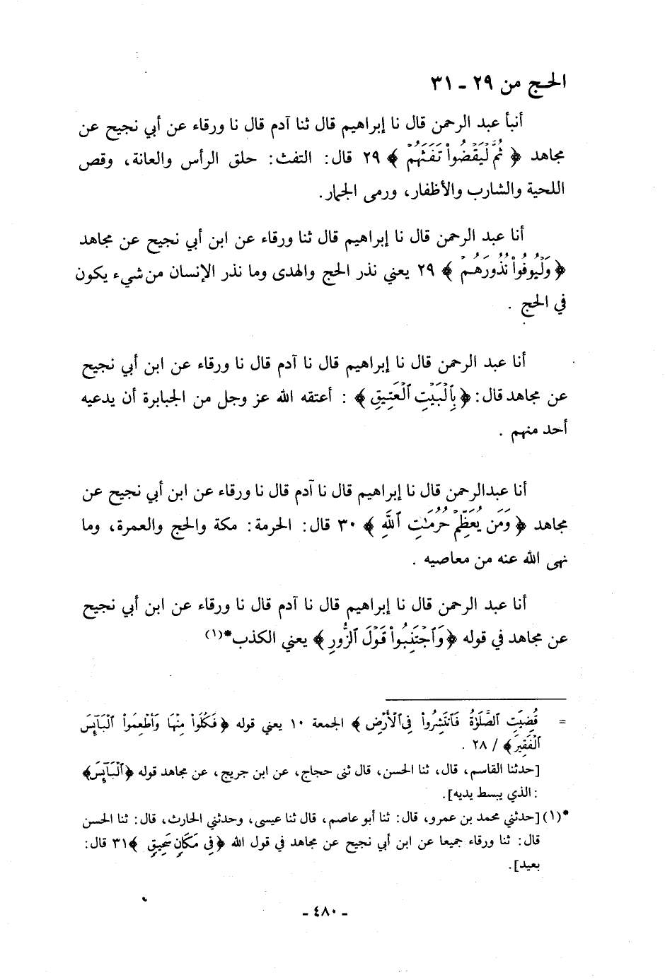 أنا عَبْدُ الرَّحْمَنِ، قَالَ: نا إِبْرَاهِيمُ، قَالَ: ثنا آدَمُ، قَالَ: ثنا وَرْقَاءُ، عَنِ ابْنِ أَبِي نَجِيحٍ، عَنْ مُجَاهِدٍ: {وَلْيُوفُوا نُذُورَهُمْ} [الحج: 29] ، يَعْنِي: «§نَذْرَ الْحَجِّ وَالْهَدْيِ، وَمَا نَذَرَ الْإِنْسَانُ مِنْ شَيْءٍ يَكُونُ فِي الْحَجِّ»
