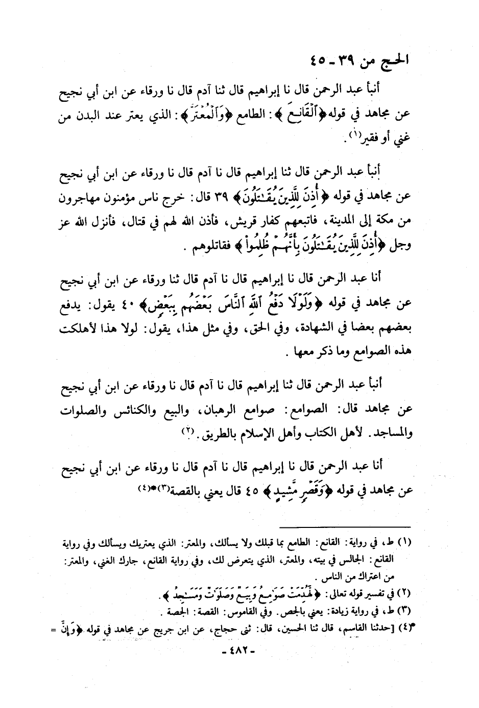 أنا عَبْدُ الرَّحْمَنِ، قَالَ: نا إِبْرَاهِيمُ، قَالَ: نا آدَمُ، قَالَ: نا وَرْقَاءُ، عَنِ ابْنِ أَبِي نَجِيحٍ، عَنْ مُجَاهِدٍ، فِي قَوْلِهِ: {§وَقَصْرٍ مَشِيدٍ} [الحج: 45] قَالَ: «يَعْنِي بِالْقَصَّةِ»