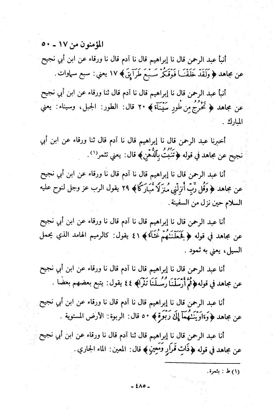 أنا عَبْدُ الرَّحْمَنِ، قَالَ: نا إِبْرَاهِيمُ، قَالَ: ثنا آدَمُ، قَالَ: نا وَرْقَاءُ، عَنِ ابْنِ أَبِي نَجِيحٍ، عَنْ مُجَاهِدٍ، فِي قَوْلِهِ: {§ذَاتِ قَرَارٍ وَمَعِينٍ} [المؤمنون: 50] قَالَ: " الْمَعِينُ: الْمَاءُ الْجَارِي "