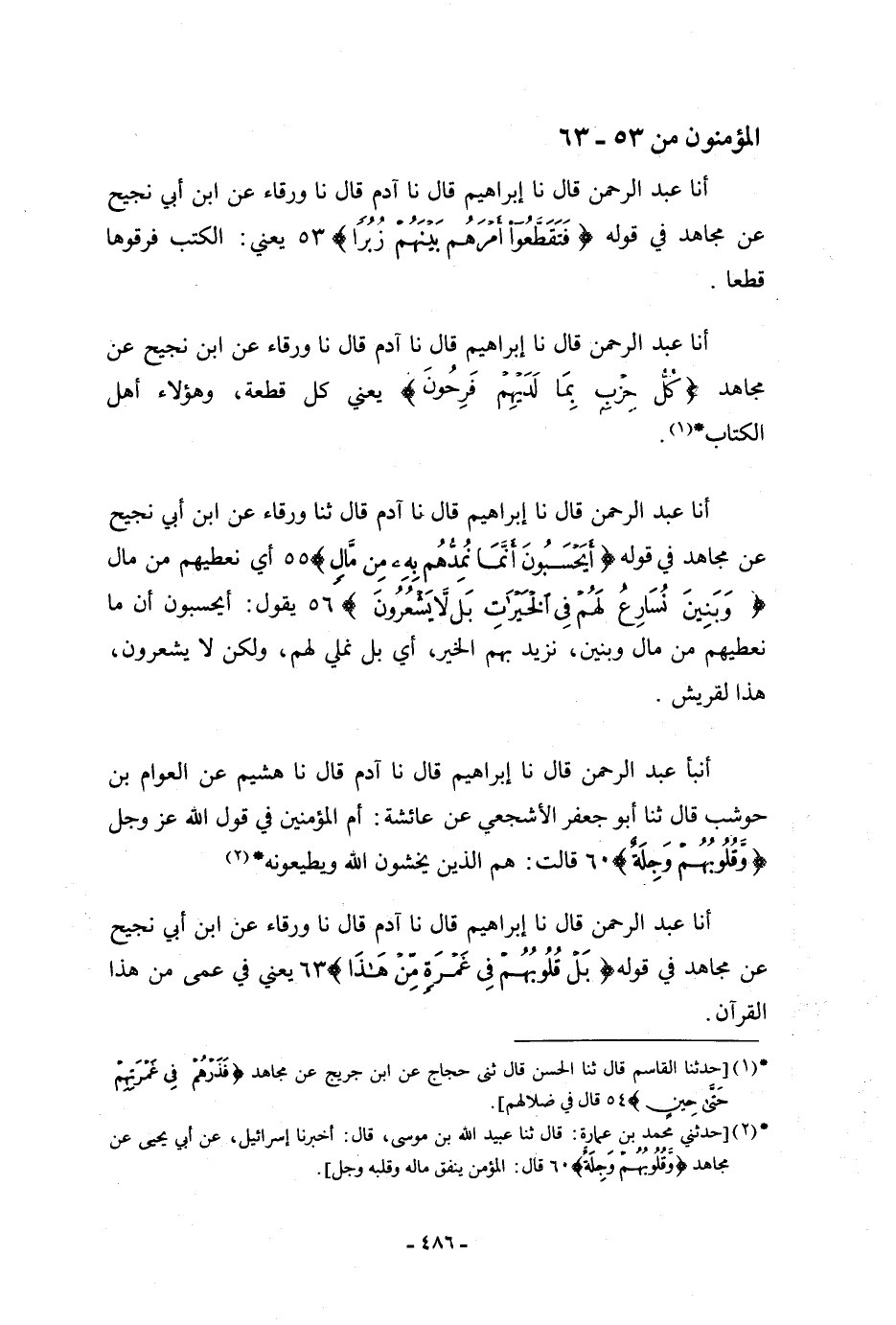 أنا عَبْدُ الرَّحْمَنِ، قَالَ: نا إِبْرَاهِيمُ، قَالَ: نا آدَمُ، قَالَ: نا وَرْقَاءُ، عَنِ ابْنِ أَبِي نَجِيحٍ، عَنْ مُجَاهِدٍ، فِي قَوْلِهِ: {§فَتَقَطَّعُوا أَمْرَهُمْ بَيْنَهُمْ زُبُرًا} [المؤمنون: 53] ، يَعْنِي: «الْكُتُبَ فَرَّقُوهَا قِطَعًا»