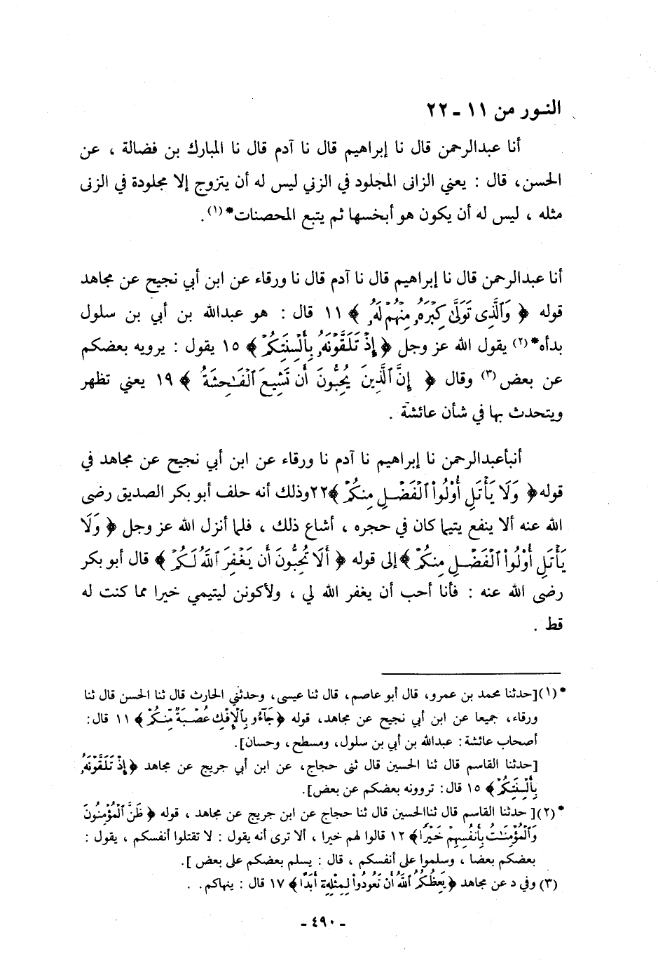 أنا عَبْدُ الرَّحْمَنِ، قَالَ: نا إِبْرَاهِيمُ، قَالَ: نا آدَمُ، قَالَ: نا وَرْقَاءُ، عَنِ ابْنِ أَبِي نَجِيحٍ، عَنْ مُجَاهِدٍ، فِي قَوْلِهِ: {§وَالَّذِي تَوَلَّى كِبْرَهُ مِنْهُمْ لَهُ} [النور: 11] قَالَ: «هُوَ عَبْدُ اللَّهِ بْنُ أُبَيِّ ابْنِ سَلُولٍ بَدَأَهُ» . يَقُولُ اللَّهُ عَزَّ وَجَلَّ {إِذْ تَلَقَّوْنَهُ بِأَلْسِنَتِكُمْ} [النور: 15] يَقُولُ: «يَرْوِيهِ بَعْضُكُمْ عَنْ بَعْضٍ» ، وَقَالَ: {إِنَّ الَّذِينَ يُحِبُّونَ أَنْ تَشِيعَ الْفَاحِشَةُ} [النور: 19] ، يَعْنِي: «تَظْهَرُ وَيُتَحَدَّثُ بِهَا فِي شَأْنِ عَائِشَةَ»