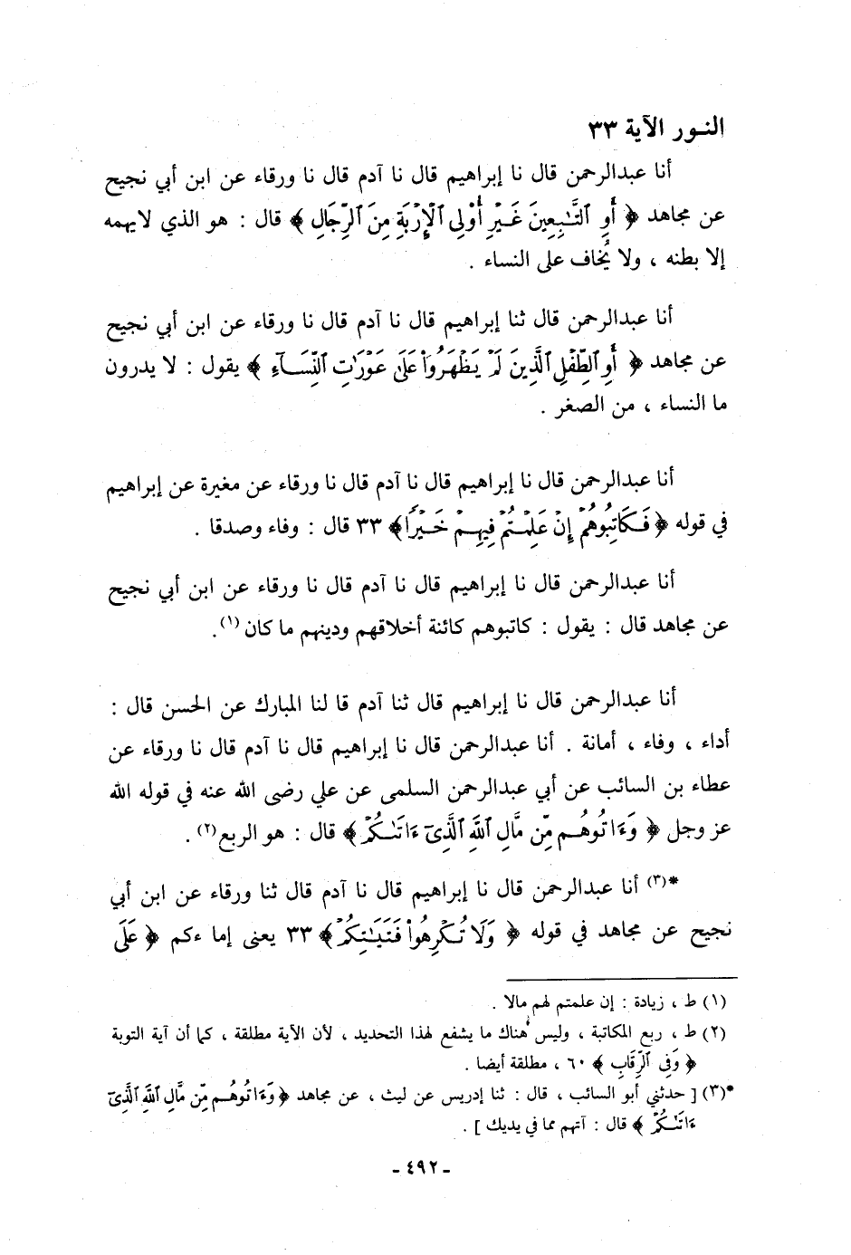 أنا عَبْدُ الرَّحْمَنِ، قَالَ: نا إِبْرَاهِيمُ، قَالَ: نا آدَمُ، قَالَ: نا وَرْقَاءُ، عَنِ ابْنِ أَبِي نَجِيحٍ، عَنْ مُجَاهِدٍ، قَالَ: يَقُولُ: «§كَاتِبُوهُمْ كَائِنَةً أَخْلَاقُهُمْ وَدِينُهُمْ مَا كَانَ»