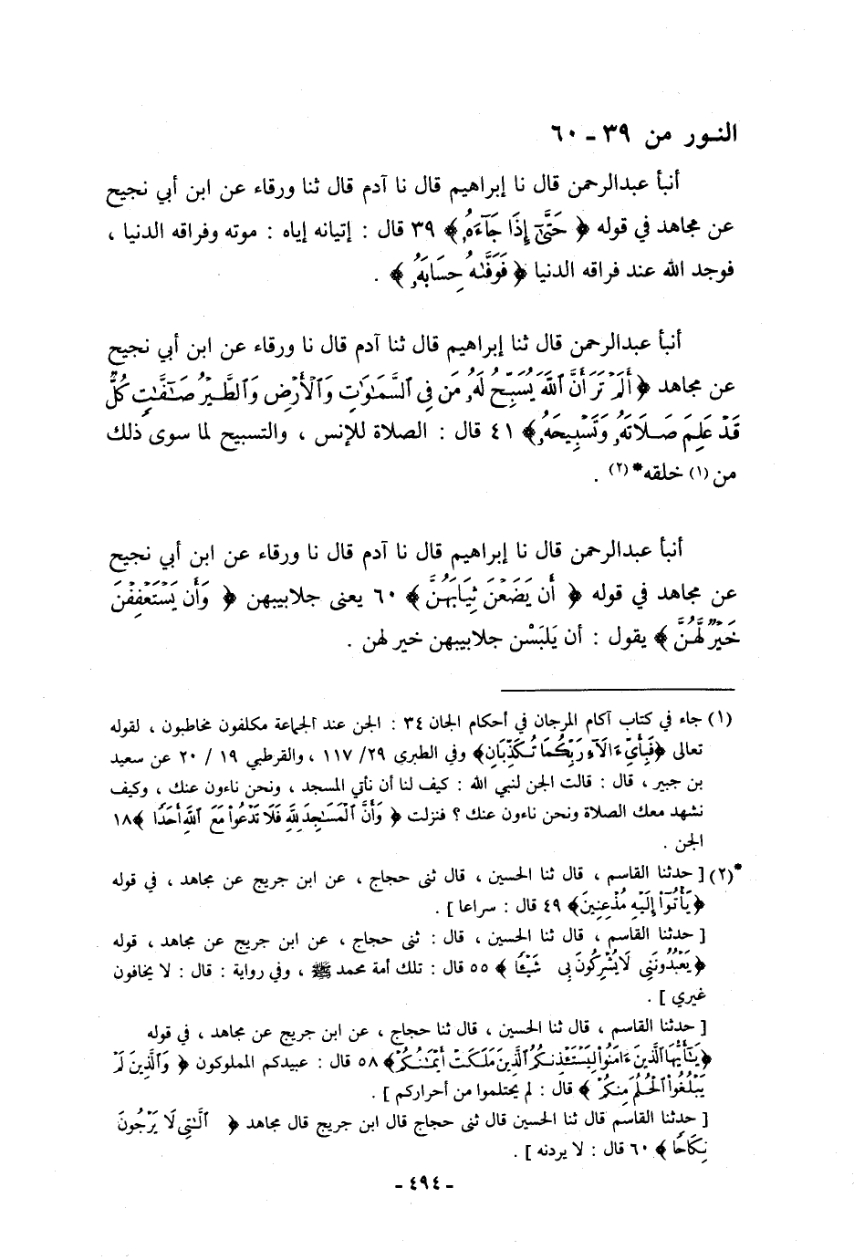 أنبأ عَبْدُ الرَّحْمَنِ، قَالَ: نا إِبْرَاهِيمُ، قَالَ: نا آدَمُ، قَالَ: ثنا وَرْقَاءُ، عَنِ ابْنِ أَبِي نَجِيحٍ، عَنْ مُجَاهِدٍ، فِي قَوْلِهِ: {حَتَّى إِذَا جَاءَهُ} [النور: 39] قَالَ: " §إِتْيَانُهُ إِيَّاهُ: مَوْتُهُ وَفِرَاقُهُ الدُّنْيَا، وَوَجَدَ اللَّهَ عِنْدَ فِرَاقِهِ الدُّنْيَا ". {فَوَفَّاهُ حِسَابَهُ} [النور: 39]