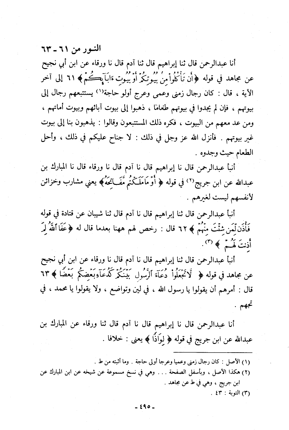 أنبأ عَبْدُ الرَّحْمَنِ، قَالَ: نا إِبْرَاهِيمُ، قَالَ: نا آدَمُ، قَالَ: نا وَرْقَاءُ، قَالَ: نا الْمُبَارَكُ بْنُ عَبْدِ اللَّهِ، عَنِ ابْنِ جُرَيْجِ، فِي قَوْلِهِ: {أَوْ مَا مَلَكْتُمْ مَفَاتِحَهُ} [النور: 61] ، يَعْنِي: «§مَشَارِبَ وَخَزَائِنَ لِأَنْفُسِهِمْ لَيْسَتْ لِغَيْرِهِمْ»