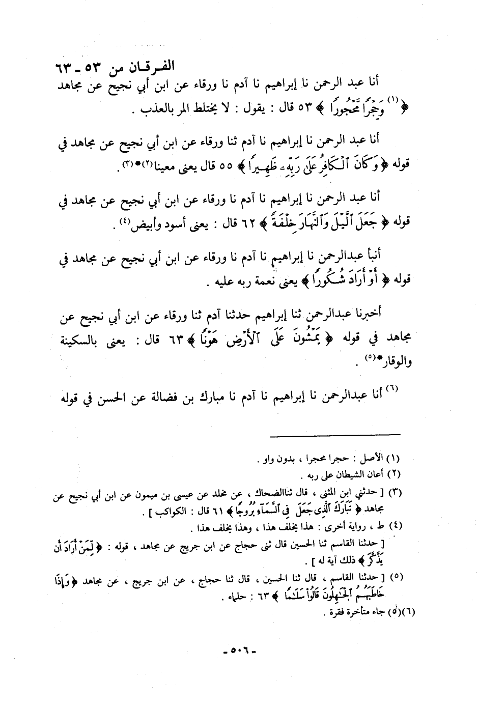 أنا عَبْدُ الرَّحْمَنِ، نا إِبْرَاهِيمُ، نا آدَمُ، نا وَرْقَاءُ، عَنِ ابْنِ أَبِي نَجِيحٍ، عَنْ مُجَاهِدٍ، {وَحِجْرًا مَحْجُورًا} [الفرقان: 53] قَالَ: يَقُولُ: «§لَا يَخْتَلِطُ الْمُرُّ بِالْعَذْبِ»