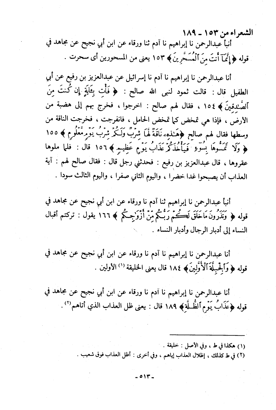 أنبأ عَبْدُ الرَّحْمَنِ، نا إِبْرَاهِيمُ، نا آدَمُ، ثنا وَرْقَاءُ، عَنِ ابْنِ أَبِي نَجِيحٍ، عَنْ مُجَاهِدٍ، فِي قَوْلِهِ: {§إِنَّمَا أَنْتَ مِنَ الْمُسَحَّرِينَ} [الشعراء: 153] ، يَعْنِي: «مِنَ الْمَسْحُورِينَ أَيْ سُحِرْتَ»