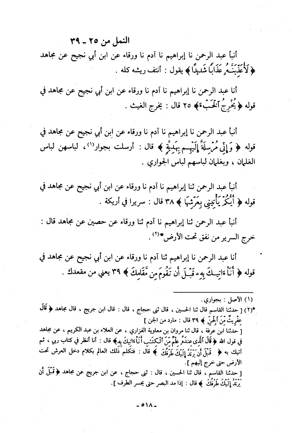 أنا عَبْدُ الرَّحْمَنِ، نا إِبْرَاهِيمُ، ثنا آدَمُ، نا وَرْقَاءُ، عَنِ ابْنِ أَبِي نَجِيحٍ، عَنْ مُجَاهِدٍ، فِي قَوْلِهِ: {§أَنَا آتِيَكَ بِهِ قَبْلَ أَنْ تَقُومَ مِنْ مَقَامِكَ} [النمل: 39] ، يَعْنِي: «مِنْ مَقْعَدِكَ»