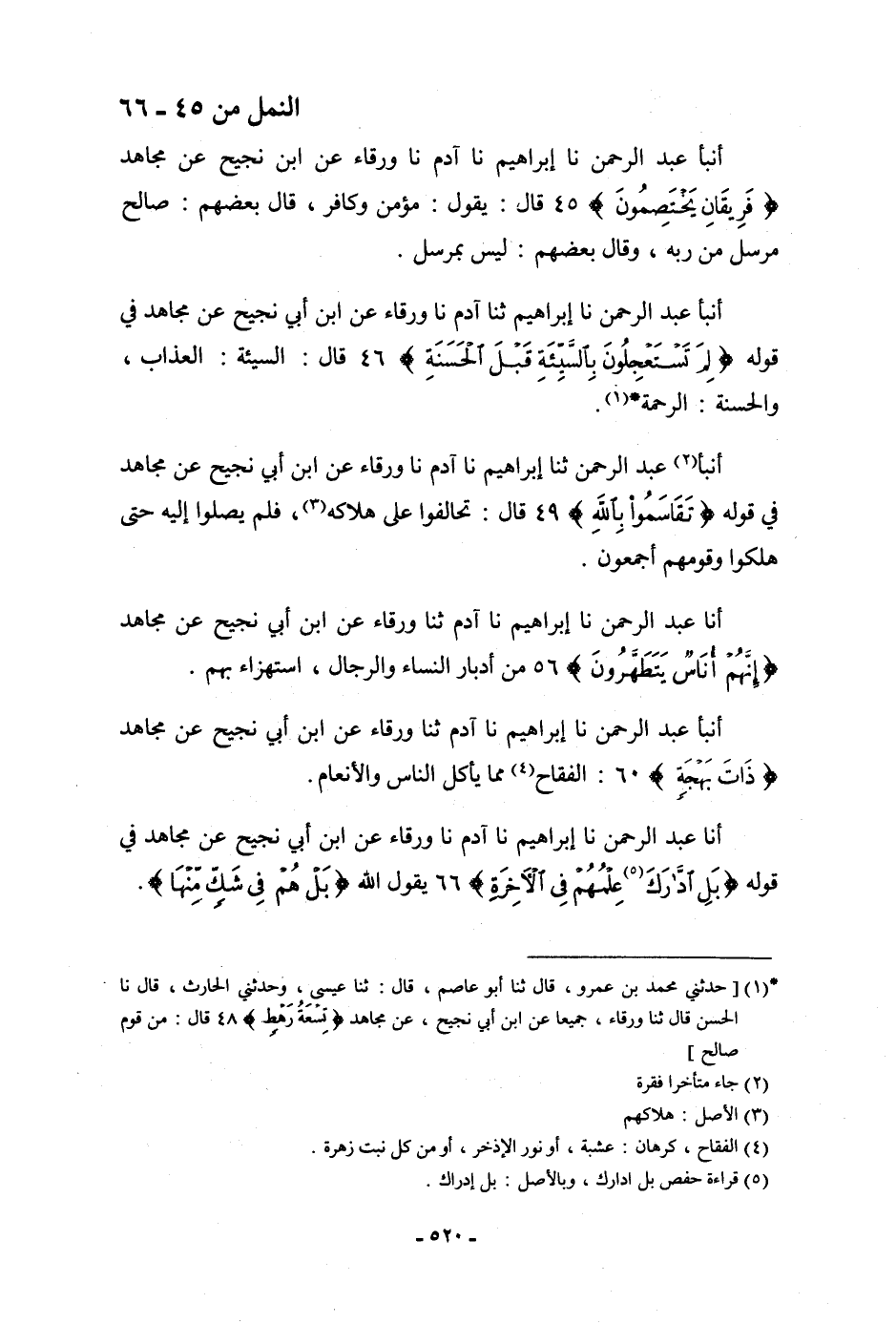أنبأ عَبْدُ الرَّحْمَنِ، نا إِبْرَاهِيمُ، نا آدَمُ، نا وَرْقَاءُ، عَنِ ابْنِ أَبِي نَجِيحٍ، عَنْ مُجَاهِدٍ: {فَرِيقَانِ يَخْتَصِمُونَ} [النمل: 45] قَالَ: " §يَقُولُ: مُؤْمِنٌ وَكَافِرٌ، قَالَ بَعْضُهُمْ: صَالِحٌ مُرْسَلٌ مِنْ رَبِّهِ، وَقَالَ بَعْضُهُمْ: لَيْسَ بِمُرْسَلٍ "