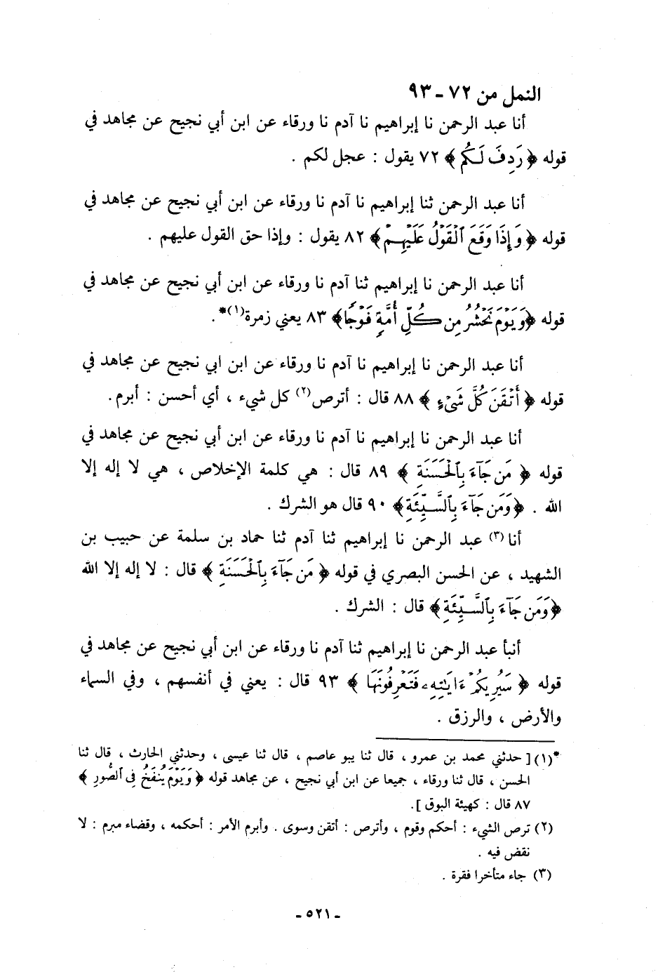 أنا عَبْدُ الرَّحْمَنِ، نا إِبْرَاهِيمُ، نا آدَمُ، نا وَرْقَاءُ، عَنِ ابْنِ أَبِي نَجِيحٍ، عَنْ مُجَاهِدٍ، فِي قَوْلِهِ: {أَتْقَنَ كُلَّ شَيْءٍ} [النمل: 88] قَالَ: " §أَتْرَصَ كُلَّ شَيْءٍ، أَيْ أَحْسَنَ: أَبْرَمَ