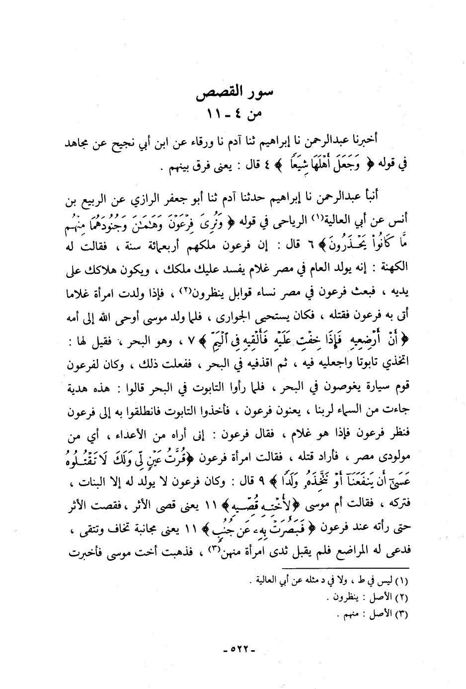 أنبأ عَبْدُ الرَّحْمَنِ، نا إِبْرَاهِيمُ، حَدَّثَنَا آدَمُ، ثنا أَبُو جَعْفَرٍ الرَّازِيُّ، عَنِ الرَّبِيعِ بْنِ أَنَسٍ، عَنْ أَبِي الْعَالِيَةِ الرِّيَاحِيِّ، فِي قَوْلِهِ: {§وَنُرِيَ فِرْعَوْنَ وَهَامَانَ وَجُنُودَهُمَا مِنْهُمْ مَا كَانُوا يَحْذَرُونَ} [القصص: 6] قَالَ: " إِنَّ فِرْعَوْنَ مَلَكَهُمْ أَرْبَعَمِائَةِ سَنَةٍ، فَقَالَتْ لَهُ الْكَهَنَةُ: إِنَّهُ يُولَدُ الْعَامَ فِي مِصْرَ غُلَامٌ يُفْسِدُ عَلَيْكَ مُلْكَكَ، وَيَكُونُ هَلَاكُكَ عَلَى يَدَيْهِ، فَبَعَثَ فِرْعَوْنُ فِي مِصْرَ نِسَاءً قَوَابِلَ يَنْظُرُونَ، فَإِذَا وَلَدَتِ امْرَأَةٌ غُلَامًا أُتِيَ بِهِ فِرْعَوْنُ فَقَتَلَهُ، فَكَانَ يَسْتَحْيِي الْجَوَارِيَ، فَلَمَّا وُلِدَ مُوسَى أَوْحَى اللَّهُ إِلَى أُمِّهِ {أَنْ أَرْضِعِيهِ فَإِذَا خِفْتِ عَلَيْهِ فَأَلْقِيهِ فِي الْيَمِّ} [القصص: 7] ، وَهُوَ الْبَحْرُ، فَقِيلَ لَهَا: اتَّخِذِي تَابُوتًا وَاجْعَلِيهِ فِيهِ، ثُمَّ اقْذِفِيهِ فِي الْبَحْرِ، فَفَعَلَتْ ذَلِكَ، وَكَانَ لِفِرْعَوْنَ قَوْمٌ سَيَّارَةٌ يَغُوصُونَ فِي الْبَحْرِ، فَلَمَّا رَأَوُا التَّابُوتَ فِي الْبَحْرِ، قَالُوا: هَذِهِ هَدِيَّةٌ جَاءَتْ مِنَ السَّمَاءِ لِرَبِّنَا، يَعْنُونَ فِرْعَوْنَ، فَأَخَذُوا التَّابُوتَ فَانْطَلَقُوا بِهِ إِلَى فِرْعَوْنَ، فَنَظَرَ فِرْعَوْنُ فَإِذَا هُوَ غُلَامٌ، فَقَالَ فِرْعَوْنُ: إِنِّي أَرَاهُ مِنَ الْأَعْدَاءِ، أَيْ مِنْ مَوْلُودِي مِصْرَ، فَأَرَادَ قَتْلَهُ، فَقَالَتِ امْرَأَةُ فِرْعَوْنَ: {قُرَّةُ عَيْنٍ لِي وَلَكَ لَا تَقْتُلُوهُ عَسَى أَنْ يَنْفَعَنَا أَوْ نَتَّخِذَهُ وَلَدًا} قَالَ: وَكَانَ فِرْعَوْنُ لَا يُولَدُ لَهُ إِلَّا الْبَنَاتُ، فَتَرَكَهُ، فَقَالَتْ أُمُّ مُوسَى: {لِأُخْتِهِ قُصِّيهِ} [القصص: 11] ، يَعْنِي: قُصِّي الْأَثَرَ، فَقَصَّتِ الْأَثَرَ حَتَّى رَأَتْهُ عِنْدَ فِرْعَوْنَ {فَبَصُرَتْ بِهِ عَنْ جُنُبٍ} [القصص: 11] ، يَعْنِي: مُجَانَبَةً تَخَافُ وَتَتَّقِي، فَدُعِيَ لَهُ الْمَرَاضِعُ، فَلَمْ يَقْبَلْ ثَدْيَ امْرَأَةٍ مِنْهُنَّ، فَذَهَبَتْ أُخْتُ مُوسَى فَأَخْبَرَتْ
