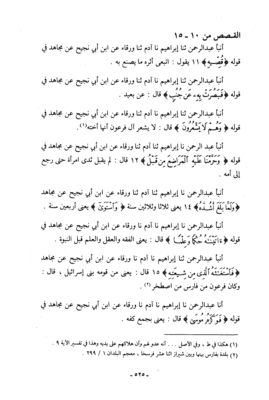 أنبأ عَبْدُ الرَّحْمَنِ، ثنا إِبْرَاهِيمُ، نا آدَمُ، نا وَرْقَاءُ، عَنِ ابْنِ أَبِي نَجِيحٍ، عَنْ مُجَاهِدٍ: {§فَاسْتَغَاثَهُ الَّذِي مِنْ شِيعَتِهِ} [القصص: 15] قَالَ: «يَعْنِي مِنْ قَوْمِهِ بَنِي إِسْرَائِيلَ» قَالَ: «وَكَانَ فِرْعَوْنُ مِنْ فَارِسَ مِنْ إِصْطَخْرَ»
