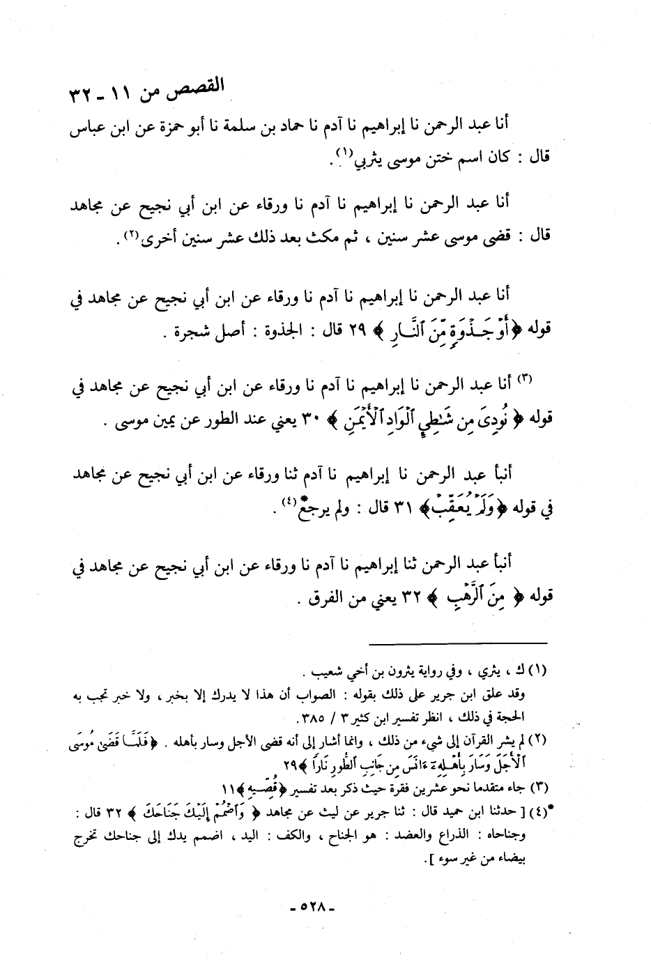 أنا عَبْدُ الرَّحْمَنِ، نا إِبْرَاهِيمُ، نا آدَمُ، نا وَرْقَاءُ، عَنِ ابْنِ أَبِي نَجِيحٍ، عَنْ مُجَاهِدٍ، فِي قَوْلِهِ: {§أَوْ جَذْوَةٍ مِنَ النَّارِ} [القصص: 29] قَالَ: " الْجَذْوَةُ: أَصْلُ شَجَرَةٍ "