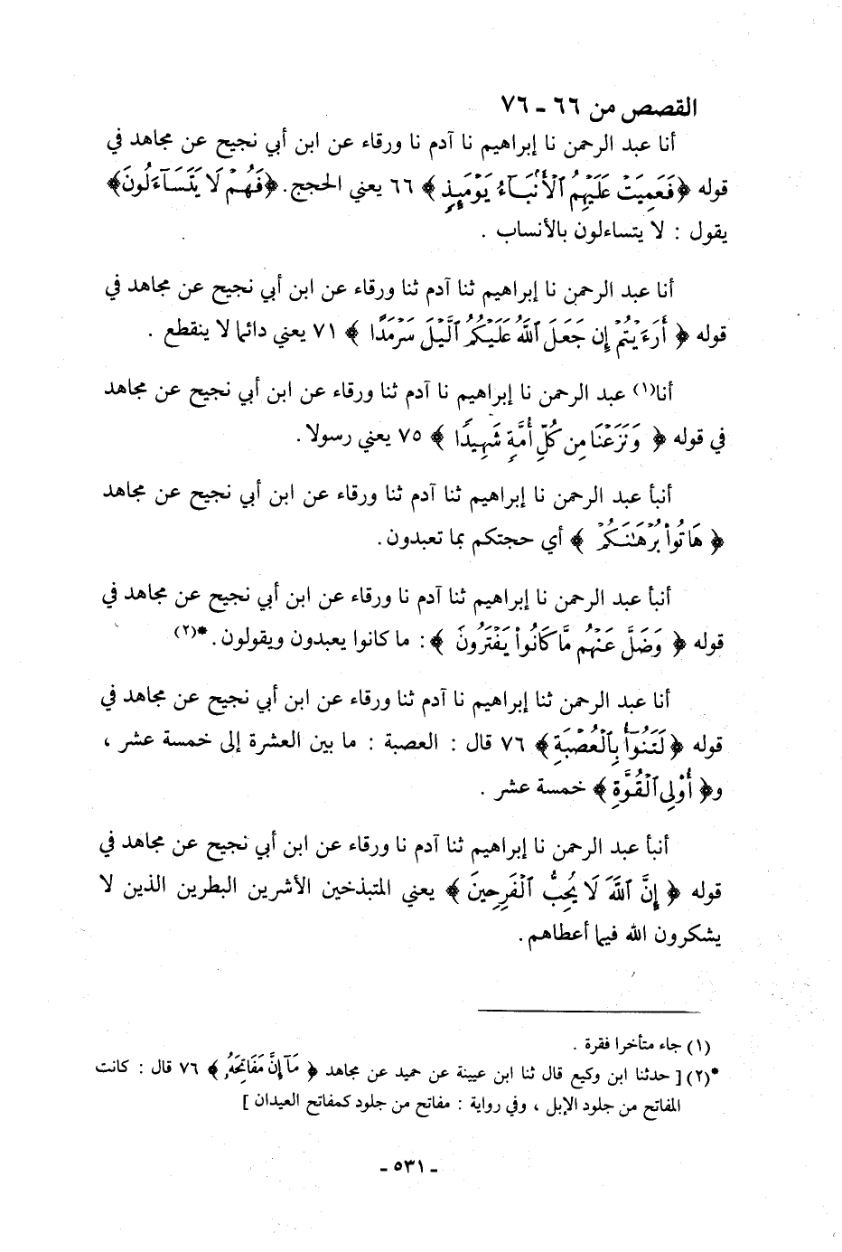 أنا عَبْدُ الرَّحْمَنِ، ثنا إِبْرَاهِيمُ، نا آدَمُ، ثنا وَرْقَاءُ، عَنِ ابْنِ أَبِي نَجِيحٍ، عَنْ مُجَاهِدٍ، فِي قَوْلِهِ: {§لَتَنُوءُ بِالْعُصْبَةِ} [القصص: 76] قَالَ: " الْعُصْبَةُ: مَا بَيْنَ الْعَشَرَةِ إِلَى خَمْسَةَ عَشَرَ "، وَ {أُولِي الْقُوَّةِ} [القصص: 76] «خَمْسَةَ عَشَرَ»