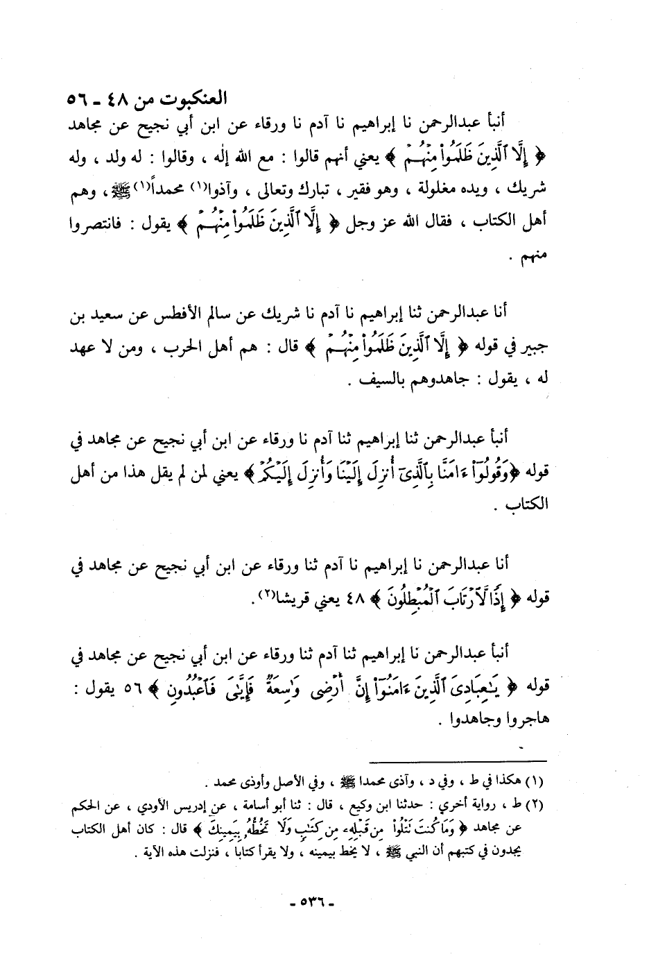 أنبأ عَبْدُ الرَّحْمَنِ، ثنا إِبْرَاهِيمُ، ثنا آدَمُ، نا وَرْقَاءُ، عَنِ ابْنِ أَبِي نَجِيحٍ، عَنْ مُجَاهِدٍ، فِي قَوْلِهِ: {وَقُولُوا آمَنَّا بِالَّذِي أُنْزِلَ إِلَيْنَا وَأُنْزِلَ إِلَيْكُمْ} [العنكبوت: 46] ، يَعْنِي: «§لِمَنْ لَمْ يَقُلْ هَذَا مِنْ أَهْلِ الْكِتَابِ»
