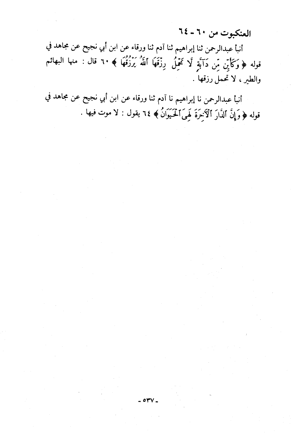 أنبأ عَبْدُ الرَّحْمَنِ، نا إِبْرَاهِيمُ، نا آدَمُ، ثنا وَرْقَاءُ، عَنِ ابْنِ أَبِي نَجِيحٍ، عَنْ مُجَاهِدٍ، فِي قَوْلِهِ: {§وَإِنَّ الدَّارَ الْآخِرَةَ لَهِيَ الْحَيَوَانُ} [العنكبوت: 64] يَقُولُ: «لَا مَوْتَ فِيهَا»