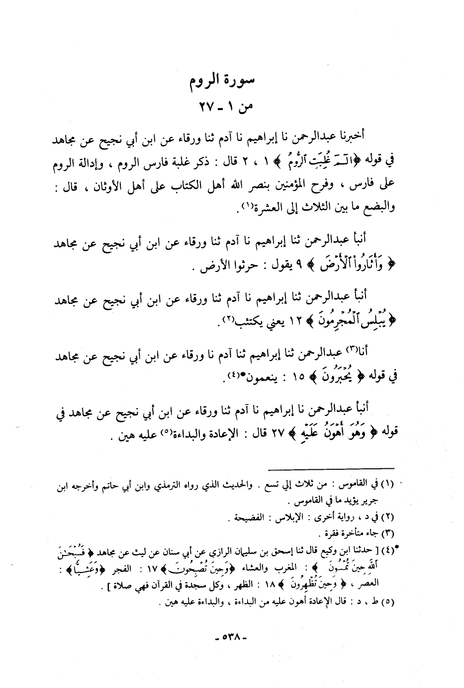 أَخْبَرَنَا عَبْدُ الرَّحْمَنِ، نا إِبْرَاهِيمُ، نا آدَمُ، ثنا وَرْقَاءُ، عَنِ ابْنِ أَبِي نَجِيحٍ، عَنْ مُجَاهِدٍ، فِي قَوْلِهِ: {الم غُلِبَتِ الرُّومُ} [الروم: 2] قَالَ: " §ذِكْرُ غَلَبَةِ فَارِسَ الرُّومَ، وَإِدَالَةِ الرُّومِ عَلَى فَارِسَ، وَفَرَحُ الْمُؤْمِنِينَ بِنَصْرِ اللَّهِ أَهْلَ الْكِتَابِ عَلَى أَهْلِ الْأَوْثَانِ، قَالَ: وَالْبِضْعُ مَا بَيْنَ الثَّلَاثِ إِلَى الْعَشَرَةِ "