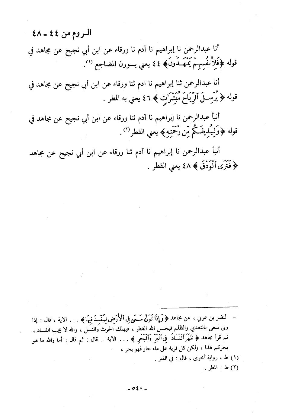 أنبأ عَبْدُ الرَّحْمَنِ، نا إِبْرَاهِيمُ، نا آدَمُ، ثنا وَرْقَاءُ، عَنِ ابْنِ أَبِي نَجِيحٍ، عَنْ مُجَاهِدٍ: {§فَتَرَى الْوَدْقَ} [الروم: 48] ، يَعْنِي: «الْقَطْرَ»