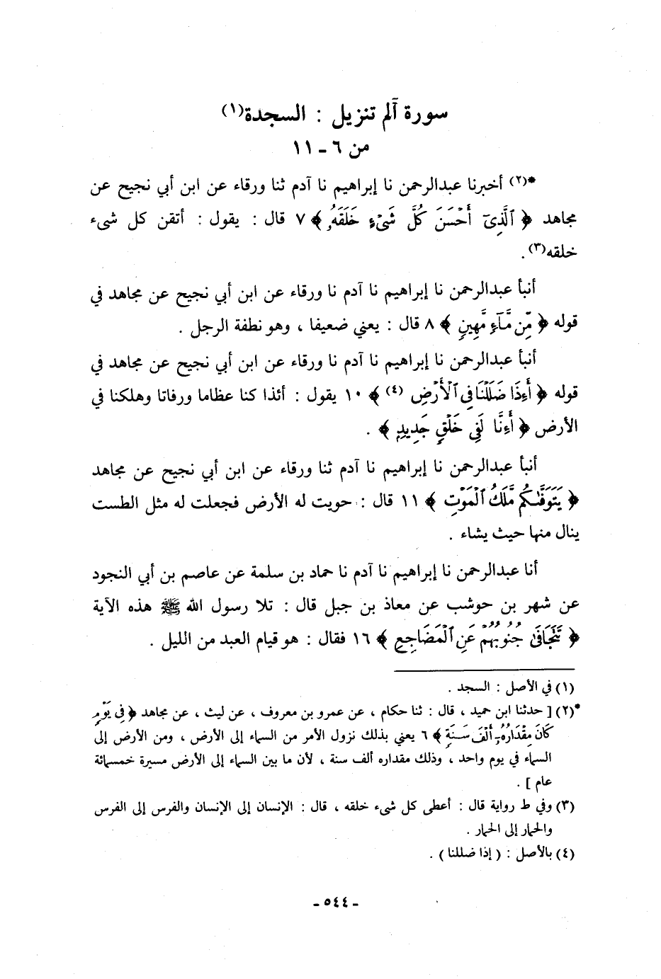 أَخْبَرَنَا عَبْدُ الرَّحْمَنِ، نا إِبْرَاهِيمُ، نا آدَمُ، ثنا وَرْقَاءُ، عَنِ ابْنِ أَبِي نَجِيحٍ، عَنْ مُجَاهِدٍ: {الَّذِي أَحْسَنَ كُلَّ شَيْءٍ خَلَقَهُ} [السجدة: 7] قَالَ: " §يَقُولُ: أَتْقَنَ كُلَّ شَيْءٍ خَلَقَهُ