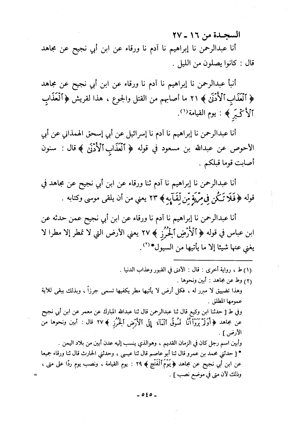 أنا عَبْدُ الرَّحْمَنِ، نا إِبْرَاهِيمُ، نا آدَمُ، نا وَرْقَاءُ، عَنِ ابْنِ أَبِي نَجِيحٍ، عَنْ مُجَاهِدٍ، قَالَ: «كَانُوا §يُصَلُّونَ مِنَ اللَّيْلِ»