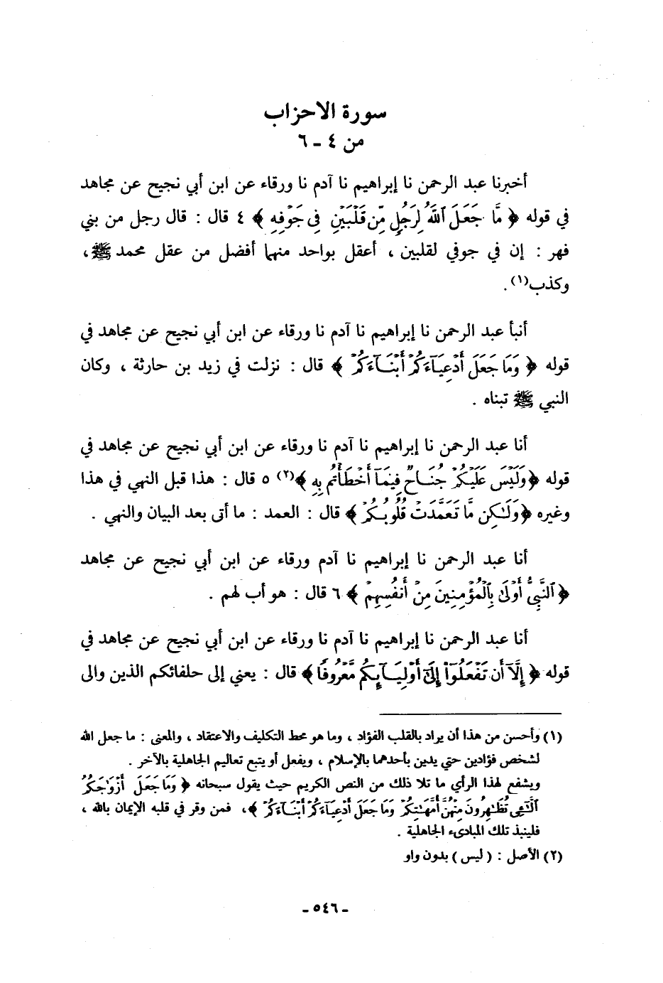 أنبأ عَبْدُ الرَّحْمَنِ، نا إِبْرَاهِيمُ، نا آدَمُ، نا وَرْقَاءُ، عَنِ ابْنِ أَبِي نَجِيحٍ، عَنْ مُجَاهِدٍ، فِي قَوْلِهِ: {وَمَا جَعَلَ أَدْعِيَاءَكُمْ أَبْنَاءَكُمْ} [الأحزاب: 4] قَالَ: «§نَزَلَتْ فِي زَيْدِ بْنِ حَارِثَةَ، وَكَانَ النَّبِيُّ صَلَّى اللَّهُ عَلَيْهِ وَسَلَّمَ تَبَنَّاهُ»