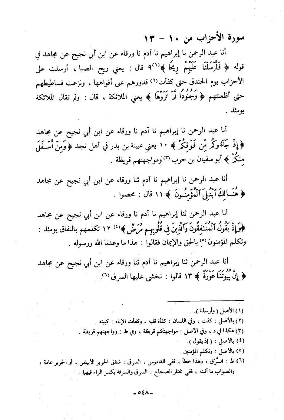 أنا عَبْدُ الرَّحْمَنِ، نا إِبْرَاهِيمُ، نا آدَمُ، نا وَرْقَاءُ، عَنِ ابْنِ أَبِي نَجِيحٍ، عَنْ مُجَاهِدٍ: {§إِذْ جَاءُوكُمْ مِنْ فَوْقِكِمْ} يَعْنِي: «عُيَيْنَةَ بْنَ بَدْرٍ فِي أَهْلِ نَجْدٍ» {وَمَنْ أَسْفَلَ مِنْكُمْ} [الأحزاب: 10] «أَبُو سُفْيَانَ بْنُ حَرْبٍ وَمُوَاجَهَتُكُمْ قُرَيْظَةُ»