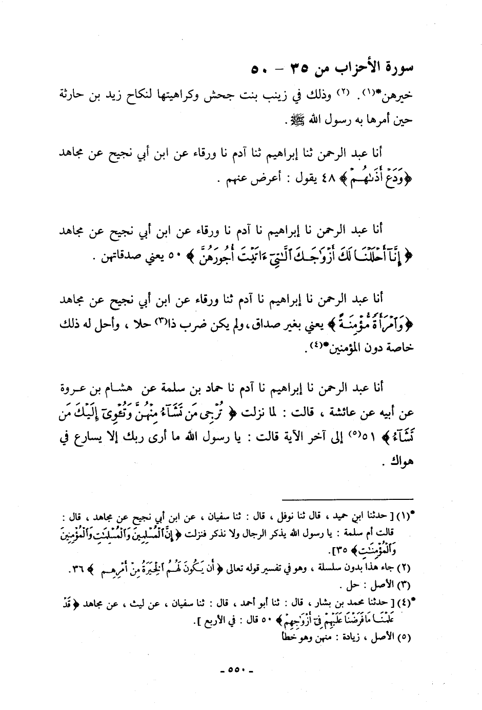 أنا عَبْدُ الرَّحْمَنِ، نا إِبْرَاهِيمُ، نا آدَمُ، نا وَرْقَاءُ، عَنِ ابْنِ أَبِي نَجِيحٍ، عَنْ مُجَاهِدٍ: {§إِنَّا أَحْلَلْنَا لَكَ أَزْوَاجَكَ اللَّاتِي آتَيْتَ أُجُورَهُنَّ} [الأحزاب: 50] ، يَعْنِي: «صَدَقَاتِهِنَّ»